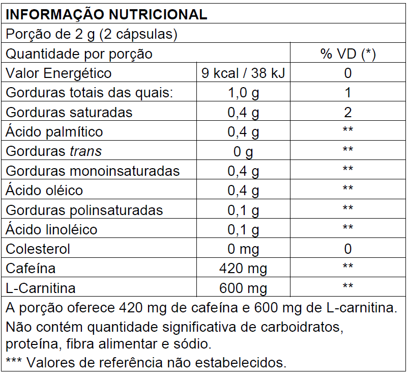L-Carnitina, cafeína e veiculo (TCM); cápsula: gelatina, água purificada, umectante (INS 422) e corante INS (172i e 171). COLORIDO ARTIFICIALMENTE. NÃO CONTÉM GLÚTEN.